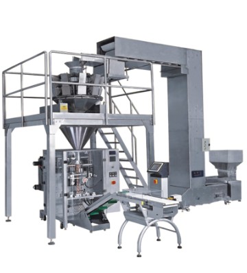 大立式包装系统包装过程中通过材料拉伸进给装置进行进给,塑料薄膜经过薄膜圆筒形成筒状,经过热纵封装置封住侧面,同时包装物注入到袋中,横封机构根据色标光电检测装置剪切包装长度和位置.