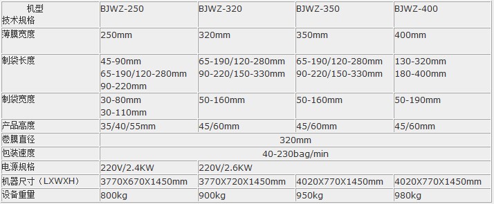 【BJWZ-250/320/350/400上走纸旋转式自动枕式包装机规格】